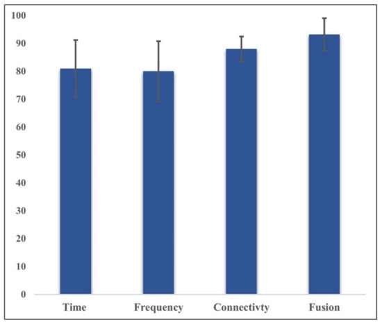 Figure 12 demonstrates the comparison of classification accuracy of each feature’s subset domain (time-domain feature, frequency domain, connectivity network feature) as well as after their fusion. In summary, these results show that SVM achieved the best classification performance when fusing connectivity features with cortical connectivity features, scoring 93.2%, 92.4%, 92.5%, and 92.1% for accuracy, precision, recall, and f1-score, respectively. Overall, fusing the multi-domain feature set from cortical and connectivity features improves the classification performance by 13% compared to a single subset domain alone.