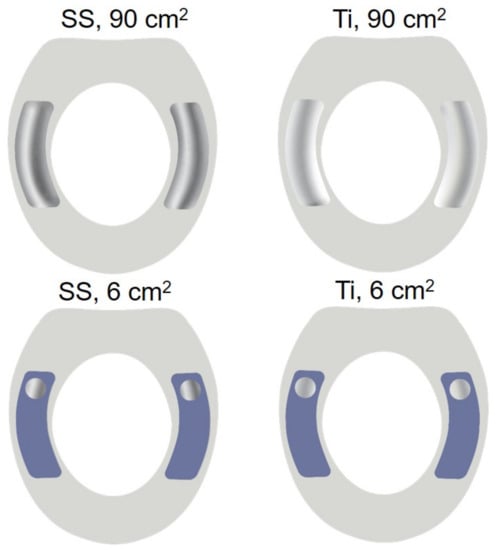 Immediately after recording the skin-electrode contact impedance measurements, ECG was captured using two sizes of SS and Ti electrodes fitted within a previously designed fully integrated toilet seat []. All the instrumentation/electronics were integrated into the toilet seat, and battery powered []. The ECG signal was differentially measured using two electrodes and an instrumentation amplifier with a high common-mode rejection ratio. The captured data was sent to a laptop via an onboard Bluetooth Low Energy radio. Different electrode configurations were integrated into the toilet seat and tested across all the subjects (N = 10). Electrode configurations comprised areas of 6 cm2, and 90 cm2, for both SS and Ti (Figure 3). For comparing signals to a high-quality signal, an alcohol swab was used in place of traditional wet electrodes. Two seat setups were used, one integrated with 90 cm2 SS and the other with 90 cm2 Ti electrodes. To achieve a smaller area of electrodes, 90 cm2 electrodes were covered with a vinyl mask, only exposing the 6 cm2 area (Figure 3). Preliminary experiments showed that electrodes completely covered with the vinyl sheet resulted in no ECG at all, thus indicating that there was no capacitive coupling of ECG signal occurring through the vinyl sheet. The ECG recordings start immediately when the subject sits on the toilet seat. Due to the measurement location, back-to-back ECG measurements across different electrode configurations were performed. For all the subjects, the measurements were performed in the following order: 90 cm2 Ti; 90 cm2 SS; 6 cm2 Ti; 6 cm2 SS. Lastly, alcohol swabs (AS) were placed on both the smaller area electrodes Ti 6 cm2 followed by SS 6 cm2. 90-s recordings were made for all the electrode configurations. The total duration for conducting the entire protocol for ECG recordings across each subject was around 20 min. All the measurements were conducted in the controlled lab environment and the subjects were asked to sit as still as possible.