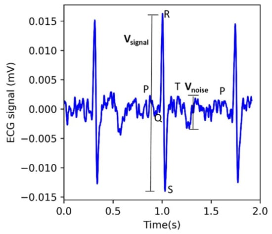 An example of signal-to-noise ratio (SNR) calculation, where Vsignal represents the peak-peak signal (R and S wave), and Vnoise represents the peak-peak noise in the segment after the T wave ends and before the P wave of the next ECG cycle begins.