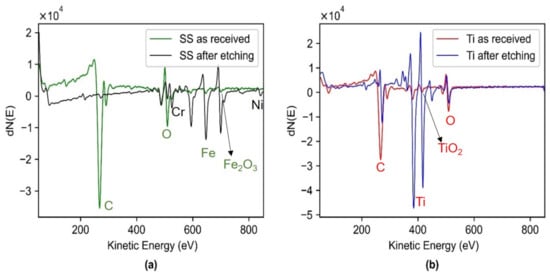 (a) AES profile for SS as received, which shows the presence of iron oxide (Fe2O3) along with carbon and oxygen. AES profile for SS after etching shows chromium and nickel become visible, and iron concentration increases. (b) AES profile for Ti as received, which shows the presence of titanium along with carbon and oxygen and the peak at 420 eV indicates the presence of TiO2. AES profile of Ti after etching shows the concentration of titanium increases and oxygen decreases.