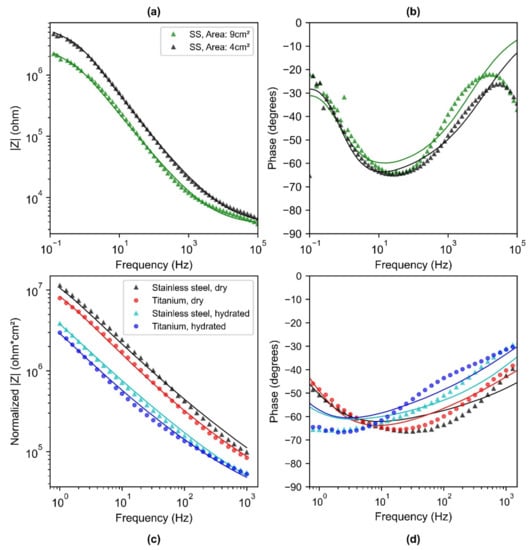 (a) Bode plot depicting the impedance magnitude (b) and phase response for SS electrode of area 9 cm2 and 4 cm2 on a dry phantom. (c) Bode plot depicting the normalized impedance magnitude and (d) phase response for SS (9 cm2) and, Ti (9 cm2) on a dry and hydrated phantom. Normalized impedance response is shown across the low-frequency range 1 Hz–1000 Hz (crucial for biopotential signals) to clearly show the differences between material and hydration in the lower frequency regime. Points represent the measured data and the solid lines represent the fitted curve obtained via the model.