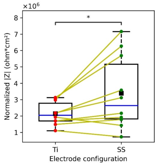 In vivo impedance measurements captured across the thigh resulted in higher skin-electrode contact impedance for SS as compared to Ti (Figure 8). The impedance spectrum was obtained from 0.1 Hz–100 kHz, but for comparison normalized impedance at 10 Hz is shown in Figure 8. FDA guidelines suggest 10 Hz as the reference frequency to validate the performance of recording electrodes [,]. The mean area-normalized electrode-skin impedance at 10 Hz for SS and Ti was 2.68 and 2.06 MΩ cm2, respectively. SS resulted in a high variance in skin-electrode contact impedance, compared to Ti, although a paired t-test (p = 0.032) indicated that the contact impedance for Ti is significantly lower than that of SS. Further, each of the five individuals above the median (blue line in Figure 8), were observed to have significantly lower impedance for Ti as compared to SS, whereas the impedance for the other five individuals below the median was found not to be significantly different.