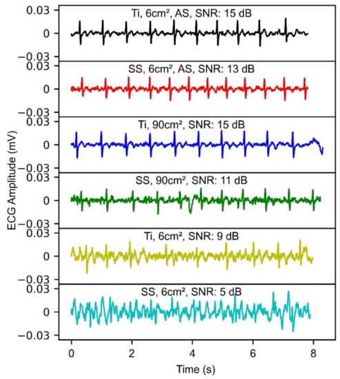 Figure 9 shows an example of ECG segments captured across one subject with different electrode configurations and their corresponding SNR. Both Ti 6 cm2 alcohol swabs (AS), shown in black, and SS 6 cm2 alcohol swabs (AS), shown in red, depicted high SNR of 15 dB and 13 dB, respectively. Ti 90 cm2, shown in blue, resulted in higher SNR as compared to SS-90 cm2, shown in green. Both Ti-6 cm2, shown in yellow, and SS-6 cm2, shown in cyan, exhibited lower SNR in comparison to larger area electrodes. Noise was significantly visible in the smaller area electrode configurations.