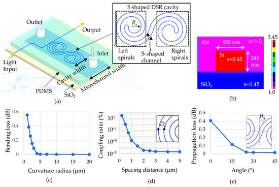 The DSR cavity was constructed by combining two single Archimedean spirals (left and right) and an S-shaped channel, as shown in Figure 1a. The spirals were designed to have the same spacing distance (DS) between successive turns to make good use of the cavity size. The right spiral was the vertically and horizontally flipped shape of the left spiral. An S-shaped channel waveguide linked two single spirals, for which θS is the angle between the vertical axis and the channel. Figure 1b shows a cross-section of the refractive index distribution of the Si-based DSR waveguide (refractive index, nSi: 3.45) built on a SiO2 substrate (nSiO2: 1.45), where air functions as the cladding layer (nair: 1). Different structures of the resonators were compared using an FDTD simulation (FullWAVE™ simulation tool, Synopsys) in the characteristic optimization of optical spectra to balance a high Q factor and the cavity length. DSR devices with optimized parameters using the simulation results were fabricated and their optical characteristics were analyzed. To save time in the simulation, a 2D FDTD analysis was used, in which the effective index of the waveguide was calculated using the finite element method (FEM) in a 3D waveguide structure with a width of 450 nm and a height of 240 nm [].