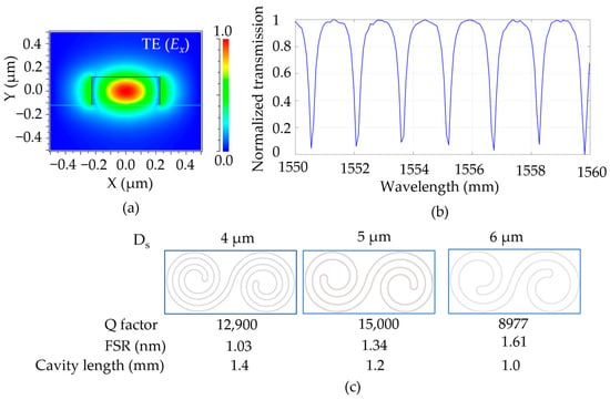 (a) Cross-section of the E field of a DSR waveguide with a width of 450 nm and a height of 240 nm in the TE (Ex). (b) Simulated transmission spectrum for the DSR cavity with a spacing distance of 5 µm. (c) The images, Q factors, FSRs, and cavity lengths of different DSR designs with different spacing distances.