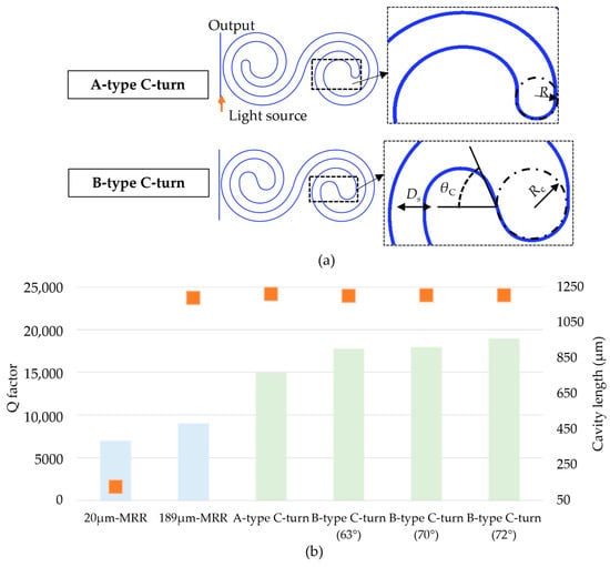 (a) Images of two different types of C-turns. The A-type C-turn had an arc diameter (Rc) as large as the spacing distance Ds. The B-type C-turn had two arcs with Rc = 5 µm linked to each other at an angle of θC. (b) The column chart of Q factors (the left axis) for different cavities of conventional microring resonators (light blue) with R = 20 µm and 189 µm, and DSR cavities (light green) with different C-turn types. The orange square markers (the right axis) are the cavity lengths of the plotted cavities.