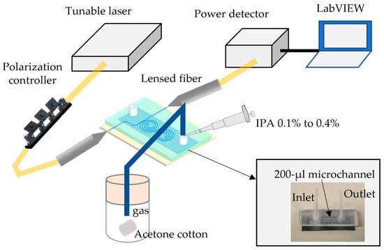 The sensing performances of the DSR cavities including the Q factors in air and water, the bulk sensitivities, and the intrinsic limits of detection were experimentally evaluated and compared with the 20 µm radius MRR. To clarify the sensing performances of the DSR cavity for different types of analytes using the microchannel-on-chip, experiments with acetone gas with different concentrations were demonstrated. The optical transmission spectra in various conditions were studied to quantify the sensing performances. The Q factors were calculated by dividing the resonance wavelength from the optical transmission spectrum by its full width at half maximum. The bulk sensitivity was estimated from the linear relationship between the refractive index of solutions with different concentrations and the resonance wavelength shifts. IPA solution (99.7%, Kanto Chemical Co., Tokyo, Japan) was used to measure bulk sensitivities. The solutions with different concentrations from 0.1% to 0.4% (v/v) were made by diluting IPA in deionized water. The intrinsic limit of detection defines a minimum refractive index change for shifting the resonance wavelength by a linewidth.
