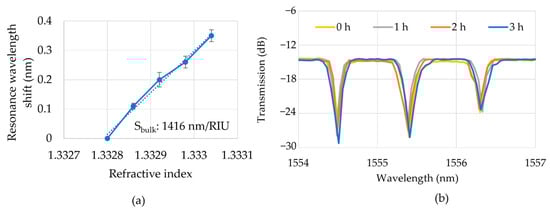 The 1.2 mm long DSR with a B-type C-turn was used to measure the bulk sensitivity in comparison with 20 µm radius MRR. Figure 6a shows the linear relationship between the refractive index (concentrations of 0.1% to 0.4%) of IPA solutions and the resonance wavelength shift of the 1.2 mm long DSR with a B-type C-turn. The refractive indices of IPA solutions were estimated from the linear relationship between the solution concentration and the refractive index []. We achieved a bulk sensitivity for the DSR of 1416 nm/RIU. The bulk sensitivity of the 20 µm radius MRR was 120 nm/RIU, as calculated by measuring the IPA solutions with concentrations of 1% to 3%. The selected IPA concentrations were different in the DSR cavity and MRR cavity to ensure the resonance wavelength shifted to be smaller than FSR. The bulk sensitivities of the 1.2 mm long DSR and 20 µm radius MRR in simulation were 1500 nm/RIU and 150 nm/RIU, respectively, as discussed in Section 3. Considering the reasons of the propagating loss caused by the fabrication process, the measurement system errors, and the surface hydrophilic, the experimental bulk sensitivity is very close to the simulation data. This result indicates the bulk sensitivity of the DSR was one order of magnitude larger than that of the 20 µm MRR in the simulation and experimental results as the result of the extended contact interface in the surface and the side wall of the DSR cavity. This result also indicates the highly exact simulation which can reduce much cost and time in fabrication. A standard deviation of the peak shift of ±20 pm was obtained. The peak shift of the same 1 µL IPA solution (concentration of 1%) was studied about ±50 pm, which was the result of the instability in the room temperature, the power and polarization matching of the input light from the tunable laser. Figure 6b shows the transmission spectrum of the 1 µL IPA solution at the times of 0 h, 1 h, 2 h, and 3 h. Therefore, the deviation of the peak shift in the bulk sensitivity measurement was in the range of the measurement condition error. In addition, it was able to keep the small-volume solution inside the microchannel for 3 h; even IPA is a volatile solution. Therefore, the effect of a longer cavity length increasing the bulk sensitivity was obvious in both the experimental results and the simulation, and using a compact cavity footprint combing with the microchannel could reduce the measurement solution.