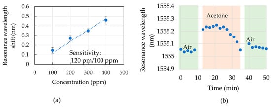 (a) Resonant wavelength shift for 1.2 mm length DSR cavity (B-type C-turn) over different acetone concentrations of 100 ppm, 200 pp, 300 ppm, and 400 ppm. (b) Resonant wavelength shifts as the environment inside the bottle changed in the sequence of air, acetone, and air. Acetone gas had a concentration of 100 ppm.
