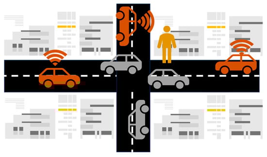 In the previous studies [,,,], the exposure dose was determined in an exposure scenario that comprised a 3D model of a transmitting car equipped with V2V antennas and a human model which was placed either close to the transmitting car to simulate a pedestrian [,,] or inside the car to simulate a passenger []. Additionally, in these latter studies, the transmitting car and the human model were placed in the air and the dose absorbed by the human model was obtained by considering only one transmitting car in the scenario with no obstacles or scatterers along the optical path between the transmitter (the car) and the receiver (the road user).