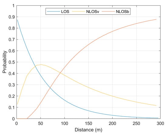 Figure 2 shows the probabilities for LOS, NLOSv, and NLOSb propagation conditions in urban settings, as calculated with the probability functions of [] (see Section 2.3 and also Equations (A5) and (A6) in the Appendix A).