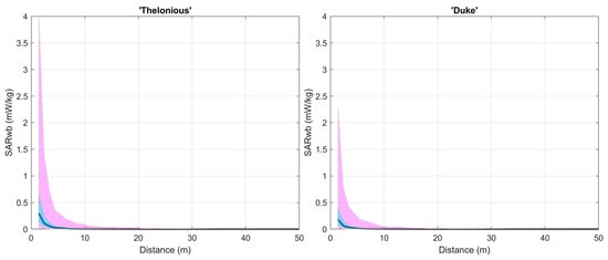 SARwb for one child model (‘Thelonious’) and one adult model (‘Duke’) as a function of the distance di from the transmitting car. The car was equipped with one antenna operated at an emitted power level of 33 dBm. SARwb was calculated in far-field conditions for an incident electric field Einc evaluated at the level of the head of each model, that is, at 1.07 m for ‘Thelonious’ and 1.70 m for ‘Duke’. For sake of clarity, the figure shows the SARwb values only for distances up to 50 m because for greater distances SARwb was negligible. The bold line is the median; the pink-shaded area is the 1st–99th percentile area; the cyan-shaded area is the 25th–75th percentile area.