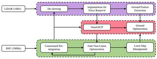 He et al. introduced an open-sourced LIO-Mapping []. By minimizing the cost factor from LiDAR and IMU measurements, this system demonstrates good performance even in challenging environments where the quality of LiDAR measurements may be degraded. Shan et al. proposed LIO-SAM [], which is based on the incremental smoothing and mapping framework iSAM2 []. This system heavily relies on feature matching to provide a LiDAR odometry factor that constrains the bias of a pre-integrated IMU factor exclusively. Furthermore, LIO-SAM requires a 9-axis IMU’s orientation as a supplementary input for position estimation, which may not be accurate in underground environments where magnetic fields can exist. Li et al. proposed LiLi-OM [], which is suitable for both solid-state and mechanical LiDARs. This system utilizes a feature-based LiDAR odometry as the front end. The back end consists of a keyframe-based sliding window optimization, which directly fuses IMU and LiDAR measurements.