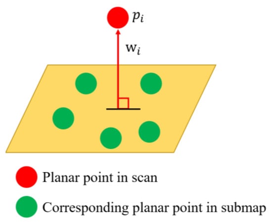 where is a plane feature point in the current scan and is the corresponding plane parameter, as shown in Figure 2. For all ground features of the current scan, we minimize all residual errors to obtain the MLE using the following equation.