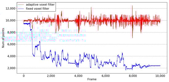 We evaluate the performance of our adaptive voxel filter using the anymal1 sequence, where the vehicle transitions from relatively open areas to narrower lanes. The initial leaf value of the voxel filter is set to 0.1 m, and the desired number of points is 10,000. We select successive segments of 1000 s from the anymal1 sequence to calculate the number of points after applying different voxel filter. The results of this experiment are depicted in Figure 4. It is observed that the number of points after applying our adaptive voxel filter fluctuates around 10,000. In contrast, the fixed-sized voxel filter leads to a rapid decrease in the number of points per scan as the vehicle enters the roadway. The information loss caused by the fixed-sized voxel filter results in an increased error in position estimation. The experiment is introduced in Section 4.4.