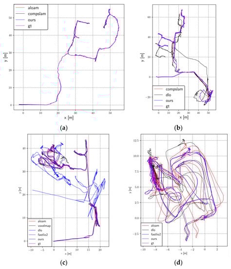 Comparison between the motion trajectories generated by different algorithms and ground truth. (a) Sequence anymal1; (b) Sequence anymal2; (c) Sequence ds3; (d) Sequence ds4.