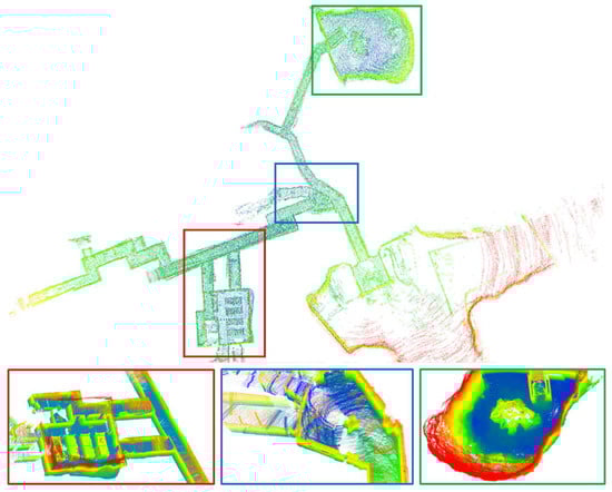 The first two datasets were collected by Team CERBERUS, utilizing their legged robot based on the ANYmal C100 series quadruped by ANYbotics. The robot was equipped with a VLP16 LiDAR sensor and an Alphasense Core, a visual-inertial sensor by Sevensense []. Our system utilized only the LiDAR and IMU data. The remaining two datasets were collected by Team Explorer using an unmanned aerial vehicle (UAV) []. The UAV has VLP16 LiDAR and an IMU. We utilized only the LiDAR and IMU data. Table 1 provides a detailed description of the datasets. All the experiments were conducted on a computer with an Intel Core i5-11400 processor, 16 GB RAM, and Intel HD Graphics. The software platform used was Ubuntu 18.04 and the Robot Operating System (ROS) Melodic 18.04. Nonlinear optimization was performed using Ceres, while the factor graph optimization was solved using GTSAM [].