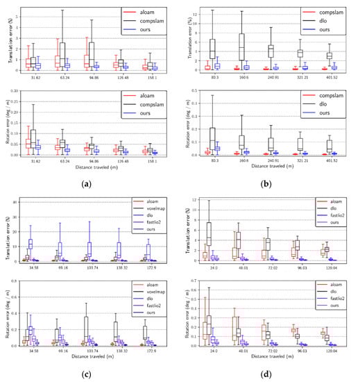 Figure 8 displays the box plots depicting the relationship between RE and trajectory length for the translation and rotation components of each successfully mapped system. The x-axis represents the percentage of the traveled distance (ranging from 10% to 50%). The y-axis for the rotation component indicates the error per meter in degrees (deg/m), while the y-axis for the translation component represents the percentage of error. All results from the four sequences are presented in Figure 8 as a separate subplot from (a) to (d). On average, our system exhibits relatively smaller translation and rotation drift compared with most other systems. In Figure 8b, the result for sequence anymal2 is plotted. It is evident that the CompSLAM outperforms our system in both translational and rotational components. This difference in performance is likely attributed to the CompSLAM’s integration of diverse independent sources of odometry, such as visual, thermal, inertial, and kinematic, to ensure robustness in various perceptually degraded environments.