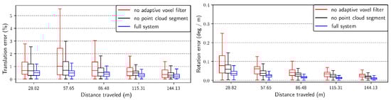 Additionally, the relative error is plotted in Figure 9. The experiment demonstrates that disabling the adaptive voxel filter or cloud segmentation leads to a decline in system performance.