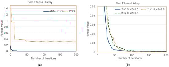 The PSO parameters are selected based on the best fitness evaluations and past research experiences in []. According to the results in Table 4, the PSO parameters are selected based on the studies on the variations in the best fitness values with different combinations of C1, C2 and ω as shown in Table 4. In Table 4, the parameters C1 and C2 are varied in the range of 1.0 ≤ C1 ≤ 2.0 and 1.0 ≤ C2 ≤ 2.0. The variations in the best fitness values of sample 1 for different combinations of C1 and C2 are summarized in Table 4. For a fixed setting of c1 = c2 = 1.5, the variations in the best fitness of sample 1 for different values of inertia ω (0.2 ≤ ω ≤ 0.8) are summarized in Table 4b. Extensive simulations show that the parameter settings ω = 0.5, 1.5 ≤ C1 ≤ 2 and 1.5 ≤ C2 ≤ 2 give the best performance. In this paper, the settings ω = 0.5, C1 = 1.5 and C2 = 1.5 were used. According to Figure 6, the settings of C1 = C2 = 1.5 give the fastest convergence of best fitness. It has been found that the convergence speed and transient behavior of the best fitness is affected by the selection of PSO parameters. However, if the PSO is allowed to run for a large number of iterations (e.g., 104), the steady-state best fitness for the proposed parameter ranges tends to converge to similar accuracy levels.
