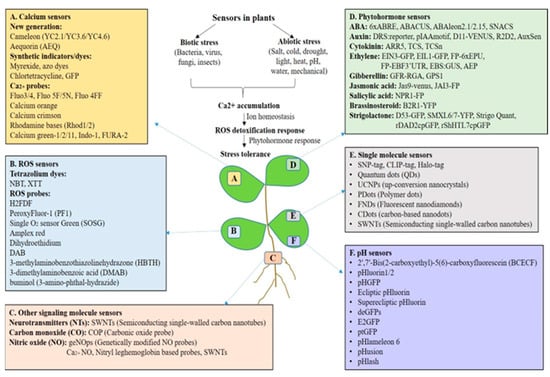 Smart farming and precision agriculture are important to boost food security throughout the world. Over the years, agriculture has undergone a series of transformations from field to customized growth chambers which provide a precisely calibrated and controlled environment, which is essential for healthy plant growth as well as for testing and adjusting the environmental parameters [,] There exist numerous biophysical instruments that can automatically track, monitor, and analyze a plant’s growth and its environmental conditions []. With the advent of sensors, real- time monitoring of environmental stressors and plants’ responses has transformed traditional farming into more precise and smart farming. Sensors (biosensors and nanosensors) play a multifaceted role in plant research such as detection of signaling molecules and environmental stressors. Smart agriculture is rapidly transforming traditional agricultural production practices across the globe. This transformation, based on technical innovation, is critical to ensuring a viable food production. One of the primary components of smart agriculture is sensors. The use of nanosensors or biosensors in plant science provides valuable insights into the role of different signaling molecules at different cellular compartments which allows researchers to explore their in vivo distribution and transport as well as reactions to environmental variables. Sensors enable the rewiring and understanding of dynamic networks of complicated plant signal transduction and metabolism at any organizational size which play a key role in targeted metabolic engineering for crop improvement. Under field conditions, sensors are used for nutrient analysis to determine whether fortification is necessary for optimal plant development, as well as to detect infections. Sensors may give a wide range of information, allowing farmers to better care for their crops and fields. Farmers can construct a holistic image of their farms, crops, and fields by gathering a variety of data via sensors, allowing them to prepare for the future. They know which fields require special attention, which are ready for crops, which crops did well with the weather, and so on. From there, they are empowered to make plans for the future. Sensors can be used to determine soil pH, soil moisture levels, soil compaction, soil composition, weed identification, the condition of farming equipment, and even weather. Owing to their multifaceted roles, sensors can reform traditional agriculture into precise smart farming which can help to track crop performance in real time under changing environmental conditions.
