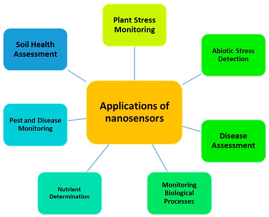 Nanobiosensors have an immense range of applications from household to industry which includes detection of a wide variety of fertilizers, pesticides, fungicides, pathogens, heavy metal content, and quality of soil such as pH, temperature, moisture content, soil water content and overall growth hormone level [,,]. In addition, farmers utilize these portable smart sensors to monitor and manage the soil conditions locally in the agricultural industry. They record the concentrations of minerals, thus insufficiencies of particular minerals in the soil, and detection of pests, pathogens, and diseases []. We have shown the application of sensors in agriculture in Figure 3.