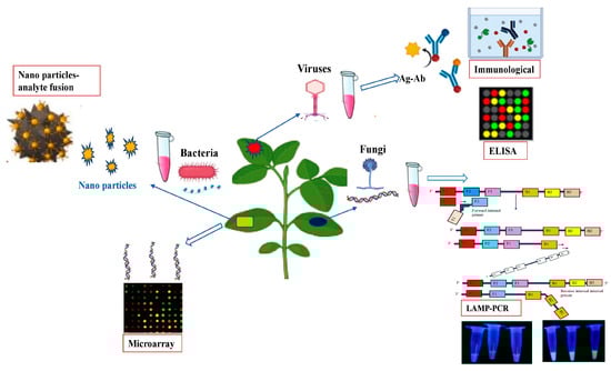 The world economy is still at risk from emerging plant diseases that continue to be a serious threat to food security and ecological stability. Plant pathogens pose a significant threat to global agriculture, with potential yield losses of up to 30% [,]. Fungal diseases cause enormous agricultural losses, hence effective management measures must be taken to prevent further infestation. The introduction of new technologies in disease detection and diagnosis has increased agricultural output by enabling real-time identification of plant diseases at an early stage of infection. Plant health monitoring increasingly requires early identification of plant pathogens in order to control diseases at various stages of development, reduce the risk of spreading, and prevent the entry of novel pathogens. Traditional procedures are deemed to lack the precision, accuracy, and sensitivity required to identify plant diseases. Conventional diagnostic methods use time-consuming, culture-dependent procedures that are especially difficult when it comes to dealing with biotrophic fungal pathogens. Traditional methods of plant pathogen identification mainly rely on descriptive methods that interpret visible symptoms in addition to isolation, culture, and laboratory-based methods that include physiological, biochemical, and pathogenicity tests []. The precision and reliability of these methods largely hinge on the expertise and proficiency of the person undertaking them. A new era in agricultural diagnostic technology was ushered in with the rapid advancement of molecular diagnostic techniques in recent decades. Plant disease identification has been made easier by the advent of novel molecular techniques which include the use of many types of the polymerase chain reaction (PCR), including nested PCR, multiplex PCR, reverse transcription (RT)-PCR, real-time PCR, and conventional PCR []. Critical immunological techniques include lateral flow assays (LFAs) [], and enzyme-linked immunosorbent assays (ELISAs), plate-trapped antigen-ELISA, and double antibody sandwich-ELISA []. Despite these benefits, molecular detection techniques are not always able to identify pathogens at low titers in materials like seeds and insect vectors, or in the early stages of infection. Moreover, cross-contamination with PCR reagents that entirely prevent the target DNA amplification can result in false negative results, whilst cross-amplification of PCR-generated non-target DNA fragments can result in false positive results. The inability to use PCR for plant pathogen identification in the field is another restriction and thus necessitates the development of other viable detection tools []. In this regard, nanosensors have emerged as an important tool for the rapid detection of plant pathogens and pests in agriculture as shown in Figure 4. Different types of nanotechnology-based tools are used for plant pathogen detection which include nano-barcoding, nanobiosensors, metal nanoparticles, quantum dots, and nanodiagnostic kits. Nanomaterials such as nanoparticles, nanowires, and nanotubes have been extensively explored for the development of sensors with enhanced sensitivity and selectivity. Nanoscale sensors offer advantages such as high surface-to-volume ratios and increased signal amplification, enabling ultrasensitive detection of phytopathogens []. In recent times, gold nanoparticles and nanostructures have been used on a large scale for the detection of plant pathogens and disease diagnostics. For instance, Xanthomonas axonopodis pv. vesicatoria, the bacterium that causes bacterial spot disease in Solanaceae plants, has been identified using sensors that combine fluorescent silica nanoparticles with antibody molecules []. Similarly, phytoplasma was detected in grapes using gold nanoparticle-coated sensors []. In Arabidopsis thaliana, an electrochemical sensor coated with gold nanoparticles was used to detect the bacterial pathogen Pseudomonas syringae []. In addition to bacterial pathogens, nanosensors can also detect fungal pathogens mainly by detecting mycotoxins. For example, the biosensor 4mycosensor detects different types of fungal mycotoxins in different crops such as oat, corn, barley and wheat []. This nano-based diagnostic kit can assist farmers in preventing disease epidemics in the field. A previous study reported that Aspergillus spss can be accurately detected using copper oxide (CuO) nanoparticles []. In strawberry, carbon nanotubes were used to detect fungal pathogens such Rhizopus and Aspergillus species []. Another noteworthy detection method is based on surface-enhanced Raman spectroscopy (SERS), which is capable of recognizing chemical fingerprints. Using silver nanoparticles (AgNPs), this approach quickly detected Alternaria mycotoxins in pear fruit, with a limit of detection (LOD) of 1.30 μg/L []. For the detection of viral pathogens in plants, QD-based nanosensors have been used in different plant systems, for example, Grapevine virus A [], Tomato ringspot virus [], Cowpea mosaic virus [], Cauliflower mosaic virus [], Citrus tristeza virus [], Bean pod mottle virus [], and Arabis mosaic virus []. Sharma et al. [] created a label-free immunosensor that detects Capsicum chlorosis virus (CaCV) in bell pepper leaves. This immunosensor was based on immobilizing viral antigens on the surfaces of gold nanoparticles (AuNPs) and multi-walled carbon nanotubes. Notably, the immunosensor had a sensitivity for CaCV detection that was 800–1000 times higher than that of DAC-ELISA. Gold nanorods (AuNRs) functionalized with antibodies specific to Cymbidium mosaic virus (CymMV) []. A new technique for detecting Citrus tristeza virus (CTV) using nanobiosensors was developed, which uses fluorescence emission from cadmium telluride quantum dots (CdTe-QDs) linked with CTV coat protein (CTV-CP) antibodies. Two sensitive detection approaches were discussed: Förster resonance energy transfer (FRET) biosensors and non-FRET-based bi