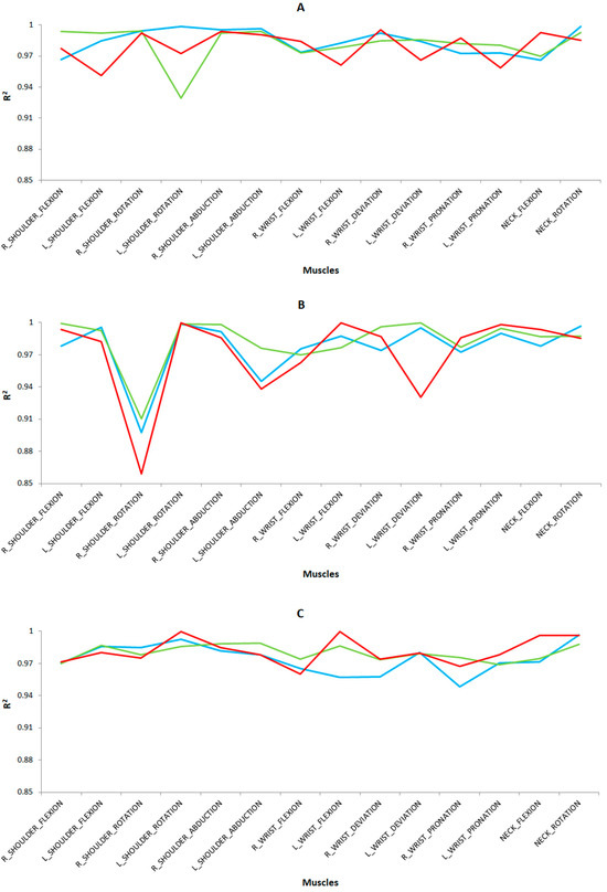 It is worth highlighting the values of the R2 coefficient for the following body postures in each task and study group: for the left cutting task (Figure 6A), we highlight the right wrist deviation (R2 = 0.9955 and RMSE = 0.0035) for the group of novice surgeons; right shoulder rotation (R2 = 0.9941 and RMSE = 0.0059) for expert surgeons on microsurgery; and right (R2 = 0.9943 and RMSE = 0.0057) and left (R2 = 0.9984 and RMSE = 0.0006) shoulder rotation; right (R2 = 0.9951 and RMSE = 0.0039) and left (R2 = 0.9966 and RMSE = 0.0024) shoulder abduction; and neck rotation (R2 = 0.9987 and RMSE = 0.0003) for the expert group of laparoscopic surgeons. For the right cutting task (Figure 6B), we underline the left shoulder rotation (R2 = 0.9994 and RMSE = 0.0004), left wrist flexion (R2 = 0.9994 and RMSE = 0.0004), and left wrist pronation (R2 = 0.9983 and RMSE = 0.0007) for novice surgeons; right shoulder flexion (R2 = 0.9989 and RMSE = 0.0006), left shoulder rotation (R2 = 0.9987 and RMSE = 0.0008), right shoulder abduction (R2 = 0.9983 and RMSE = 0.0007), right (R2 = 0.9962 and RMSE = 0.0028) and left (R2 = 0.9997 and RMSE = 0.0007) wrist deviation, and left wrist pronation (R2 = 0.9947 and RMSE = 0.0053) for expert microsurgeons; and left shoulder flexion (R2 = 0.9957), left shoulder rotation (R2 = 0.9988 and RMSE = 0.0007), left wrist deviation (R2 = 0.9948 and RMSE = 0.0052), and neck rotation (R2 = 0.9964 and RMSE = 0.0026) for surgeons skilled in conventional laparoscopic surgery.