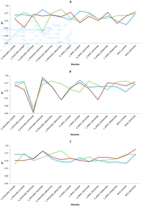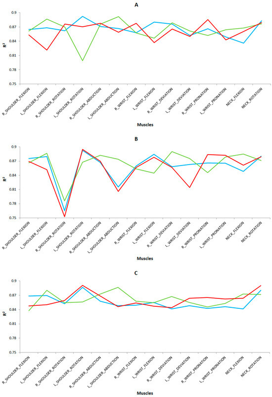 For the labyrinth task (Figure 8C), we highlight the left shoulder rotation (R2 = 0.7787 and RMSE = 0.0213) and neck rotation (R2 = 0.7861 and RMSE = 0.0230) for novice surgeons; left shoulder flexion (R2 = 0.7686 and RMSE = 0.0314), right shoulder flexion (R2 = 0.7685 and RMSE = 0.0315), left shoulder abduction (R2 = 0.7807 and RMSE = 0.0203), and neck flexion (R2 = 0.7666 and RMSE = 0.0334) for expert microsurgeons; and right (R2 = 0.7663 and RMSE = 0.0337) and left (R2 = 0.7656 and RMSE = 0.0344) shoulder flexion, left shoulder rotation (R2 = 0.7784 and RMSE = 0.0216), and neck rotation (R2 = 0.7665 and RMSE = 0.0335) for expert laparoscopic surgeons.