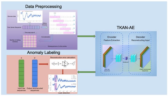 The whole structure of the proposed leak detector in this paper is illustrated in Figure 1, including data preprocessing, the construction of TKAN-AE, and anomaly labeling. Initially, the negative pressure wave data, which are obtained from real city pipelines, undergoes preprocessing steps like basic noise reduction, applying sliding window averages, and normalization. This results in turning the original data into subsequence datasets. Next, the subsequences are compressed by the encoder into latent variables and then reconstructed by the decoder. Afterward, the reconstructed data are compared with the original dataset, and the reconstruction loss for each individual point is measured. Next, the reconstruction error curve is plotted, and our proposed anomaly sequence labeling method is applied to detect anomalies.