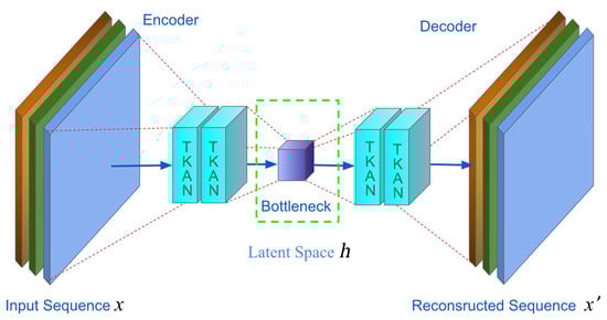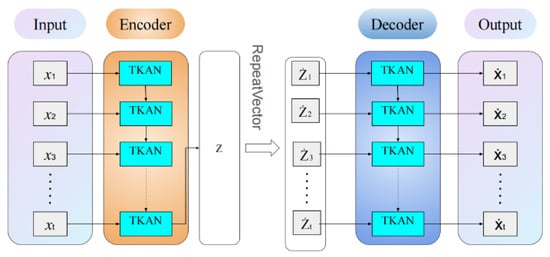 To address the specific requirements of time series anomaly detection, we developed a novel model named TKAN-AE (as illustrated in Figure 5, showing the detailed structure of the proposed TKAN-AE network). This model integrates the Temporal Kolmogorov–Arnold Network (TKAN) within an autoencoder (AE) architecture, effectively capturing salient features of time series data. The TKAN component combines the temporal gating mechanism of Long Short-Term Memory (LSTM) networks with the powerful function approximation capabilities of Kolmogorov–Arnold Networks (KANs), thus capturing both long-term and short-term dependencies inherent in time series data. Meanwhile, the autoencoder’s encoder–decoder structure facilitates the learning of efficient data representations, reconstructing the input to identify anomalies.