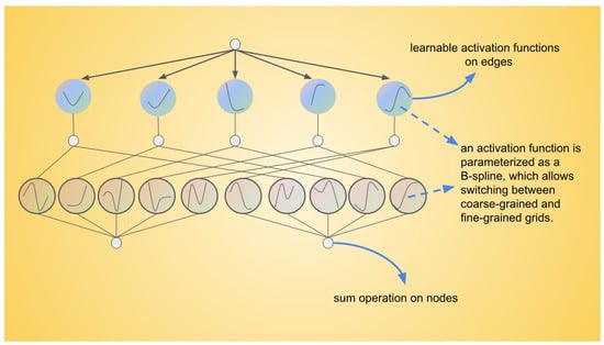 The Kolmogorov–Arnold Network (KAN)’s structure is shown in Figure 3. In the presented diagram, the activation functions are not located at the nodes but are instead assigned to the connecting edges, with each edge associated with a learnable activation function parameterized as a B-spline. This configuration allows the activation functions to adapt dynamically between coarse-grained and fine-grained resolutions. Unlike traditional Multilayer Perceptrons (MLPs), which employ fixed activation functions at each node, Kolmogorov–Arnold Networks (KANs) utilize these learnable B-spline functions along the edges. The signals transmitted between nodes are aggregated using a simple summation operation, meaning that the nodes themselves only perform summation without involving activation functions. This design results in faster computational speed and improved interpretability, as the complexity of the activation functions resides in the edges rather than the nodes. The KAN network is inspired by the Kolmogorov–Arnold representation theorem []. The Kolmogorov–Arnold representation theorem (Equation (5)) states that any multivariate continuous function can be represented as a combination of univariate functions and addition operations: