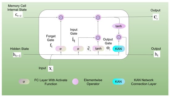 Temporal Kolmogorov–Arnold Networks (TKAN) adapt the concept of Kolmogorov–Arnold Networks (KANs) to time series by integrating temporal management within neural networks. As shown in Figure 4, this approach combines the KAN architecture with a modified Long Short-Term Memory (LSTM) unit. The learnable activation functions in KAN capture complex nonlinear patterns in time series data, while LSTM cells, with their gating mechanisms and memory units, effectively address the challenges of long-term dependencies and the vanishing/exploding gradient problem common in traditional RNNs. This enables the model to retain information about past events over extended time horizons, enhancing its ability to model long-range temporal dependencies. Although the intricate architecture of LSTM may slightly increase computational costs, this trade-off is justified in specific learning tasks such as pipeline leak detection, where high accuracy is paramount.