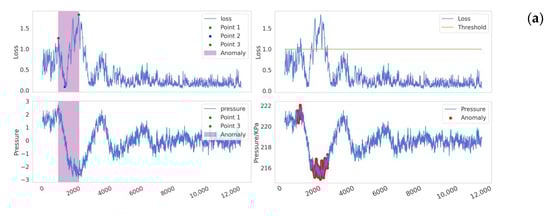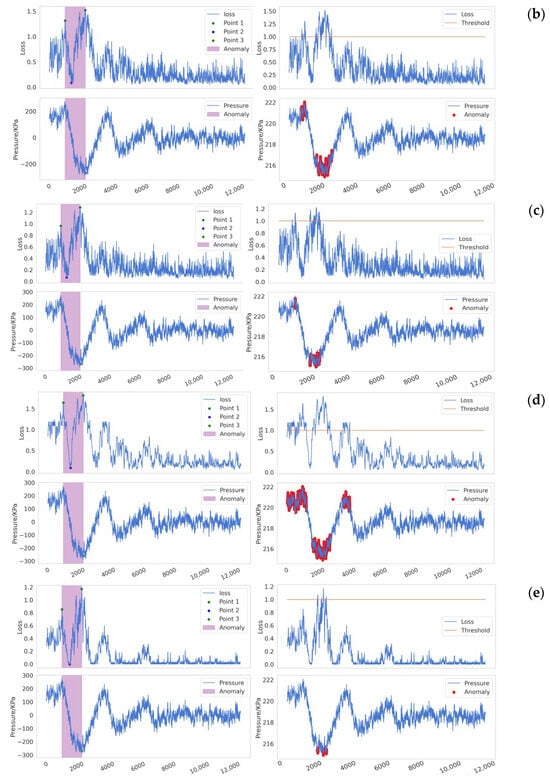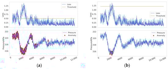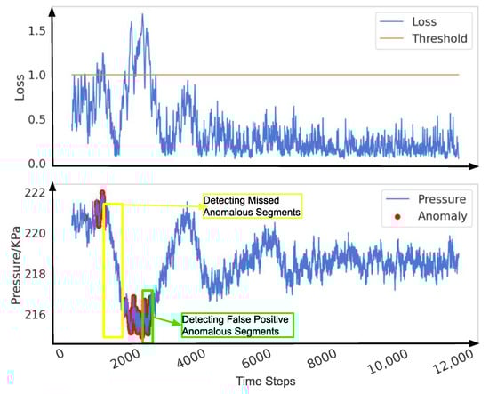 Reconstruction error is defined as the difference between the reconstructed data and the original data. In anomaly detection methods based on reconstruction error, it is generally assumed that the reconstruction error of normal data is small, while the reconstruction error of anomalous data is large. As illustrated in Figure 6 when a pipeline leak occurs (the bottom subplot in Figure 6), the reconstruction error (or loss) typically increases sharply in the initial phase (the upper subplot in Figure 6), but it may gradually decrease as the leak continues. This phenomenon arises because the model gradually learns the characteristics of the leakage process and attempts to reconstruct and predict it. As the negative pressure wave propagates through the pipeline system, the internal pressure of the pipeline rises significantly. For a model that has already learned the anomalous features, this sudden pressure increase leads to a sharp rise in the reconstruction error. However, in traditional threshold-based detection methods, data are classified as anomalous only when the reconstruction error exceeds a predefined threshold. Due to the decrease in the reconstruction error during the leakage process, certain signals that should be identified as indicative of a leak may be overlooked in specific local regions, resulting in missed detections, as shown in the yellow box. Furthermore, the subsequent rise in pressure caused by the propagation of the negative pressure wave can lead to an increase in the reconstruction error, thereby causing false positives, as shown in the green box. The issue of threshold selection has long been a challenge in anomaly detection. Research by Xue Yang et al. [] has shown that fixed or static thresholds often fail to adapt to the dynamic characteristics of real-world data, resulting in false positives or missed detections. As shown in Figure 7, setting thresholds too low (Figure 7a) or too high (Figure 7b) can lead to significant false positives or false negatives, which, in industrial applications, may result in serious losses and accidents.
