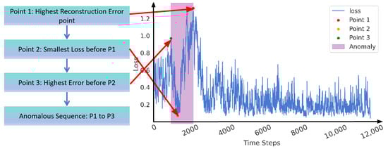 As illustrated in Figure 8, showing the flowchart of anomaly detection and labeling methods for pipeline leaks, the specific detection procedure is as follows: We initially identify point P1, corresponding to the maximum reconstruction error. Subsequently, within the sequence leading up to P1, we determine point P2, which represents the minimum loss value. Finally, we locate point P3, characterized by the maximum reconstruction error preceding P2. The sequence between points P1 and P3 is defined as the potentially anomalous region, which is highly indicative of leakage. The detailed experimental comparison process and results will be elaborated in the subsequent sections.