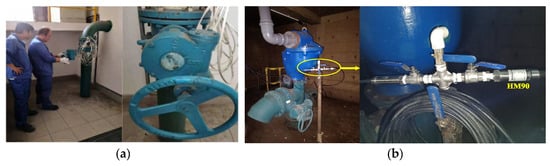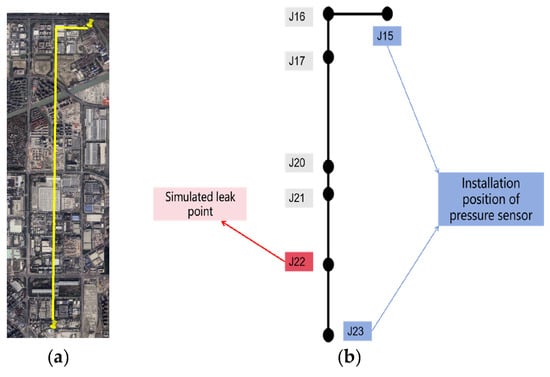 The field experiments were conducted on water supply pipelines located underground at Shenjiang Road and Wuzhou Avenue in Pudong New District, Shanghai, China (the yellow line in Figure 9a). The total length of the pipeline involved in the experiment was 5891 m. High-frequency dynamic pressure sensors were installed at wells J15 and J23 (Figure 9b) to monitor pressure fluctuations. To simulate leak events, a valve located at well J22 was manipulated to induce leakage, with different valve openings representing varying leakage severities (Figure 10a), and the sensor installation diagram for the field site is shown in Figure 10b. Furthermore, the exact times for opening and closing the valves were recorded to provide reference data for subsequent model evaluation. The distance between J15 and J22 was approximately 4981 m, that between J15 and J23 was about 5891 m, and that between J22 and J23 was around 910 m.