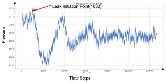 Figure 11 provides an example of pressure signal data, illustrating that a sharp drop in pressure occurs when a pipeline experiences a leakage event. This phenomenon is primarily caused by the rapid outflow of fluid at the leakage point, resulting in a localized pressure reduction. Subsequently, due to the generation of a negative pressure wave and its propagation towards both ends of the pipeline, significant changes occur in the internal pressure dynamics of the pipeline. The propagation of the negative pressure wave induces fluid near the leakage point to move towards the low-pressure zone, leading to a transient pressure rise and forming a U-shaped waveform. Over time, as the negative pressure wave reflects and attenuates within the pipeline, the system eventually reaches a new steady-state pressure, which, in the short term, falls below the original operating pressure. This temporary reduction in steady-state pressure is due to the ongoing fluid loss at the leakage point.