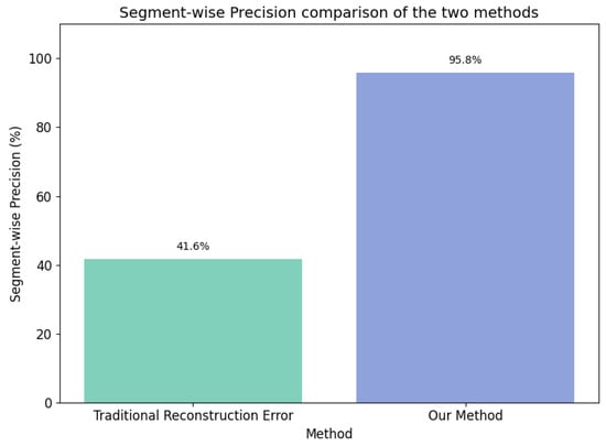 In this experiment, we compared the performance of six detectors, resulting from the combination of five models (TKAN-AE, LSTM-AE, GRU-AE, Transformer–AE, and Informer–AE) with two different anomalous sequence labeling methods (Figure 13). We have provided links to publicly available runnable code for the comparative example experiments in the Data Availability Statement section, allowing others to conduct reproducible experiments and further develop in-depth research based on our work. This comparison not only evaluated the performance of each model but also verified the superiority and robustness of the proposed labeling approach. Figure 14 presents specific detection instances, where subfigures (a), (b), (c), (d), and (e), respectively, illustrate the visual comparison between our proposed method and the traditional methods for the five models. Through the study of specific leakage detection tasks, we observed that for the same model, the differences brought by the different labeling methods were quite significant. The traditional labeling method based on reconstruction error thresholds tended to miss a substantial number of intermediate leakage segments, and it also incorrectly labeled a short sequence as anomalous after the leakage had ended, leading to notable false negatives and false positives (Figure 14). In contrast, our proposed new labeling method effectively avoided these issues, significantly improving the labeling accuracy. Furthermore, under the same labeling method, the detection capabilities of the five models weare generally consistent. Figure 15 further provides a detailed comparison of the segment-wise precision between the two labeling approaches. Our method outperformed the traditional methods by 54.2% in terms of segment-wise precision.
