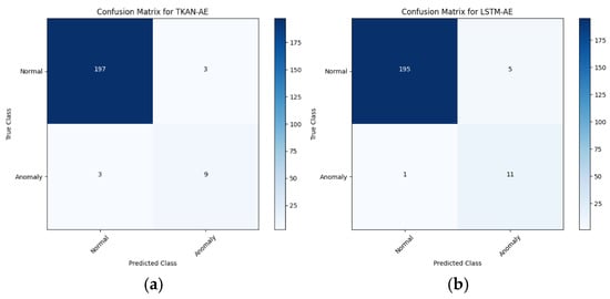 Table 3 presents a comparative analysis of the aforementioned five models, emphasizing fairness by employing the newly proposed annotation method across all models. By examining the confusion matrices of the five models in Figure 16a–e, it is evident that all models demonstrated excellent anomaly detection accuracy and the ability to identify specific abnormal sequences on the actual dataset. TKAN, Transformer, and Informer exhibited balanced performance, maintaining good consistency between precision and recall and achieving high F1 scores, which highlights the overall stability of these models. In contrast, LSTM showed a higher recall but a lower precision compared to TKAN, indicating a tendency to produce more false positives. Additionally, the relatively lower recall of GRU suggests potential issues with missing certain anomalies, revealing its limitations.