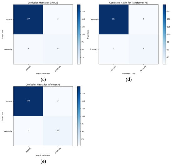 The confusion matrices of five models. Subfigures (a)–(e) respectively illustrate the detection confusion matrices for five models—TKAN, LSTM, GRU, Transformer, and Informer—each integrated with an Autoencoder and all employing our proposed anomalous sequence labeling approach.
