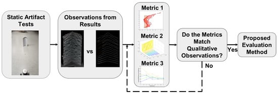 One fused data type in LiDAR–camera sensor fusion is colored point clouds, which are used as a representation of objects and for capturing differences in appearance. Colored point clouds are the closest data type to how humans see their surroundings because they contain color and distance values of an environment. While test artifacts have been developed for camera images [] and stereo camera setups [], the assessment of colored point clouds is still an active area of study. Point Cloud Quality Assessment (PCQA) is an evaluation technique to measure the distortion an object within a point cloud. PCQA can be implemented through a subjective or objective approach. Subjective PCQA involves using human subjects to grade point cloud objects based on their discretion, while objective PCQA uses computations and calculated metrics to compare point clouds of the same object []. Objective PCQA is further categorized by the presences of a reference model of the object. Objective PCQA techniques can either compare a distorted model to a highly dense reference model and measure the differences [,], use some features of a reference model for comparison [,], or use no reference model and develop a different method to measure the distortion [,]. These techniques are known as full-reference, reduced-reference, and no-reference methods, respectively. There also exist prior methods for full-reference PCQA using public datasets [,]. For instance, test objects have been integrated into public datasets for the evaluation of point clouds [,]. However, such an approach is expensive and no standard exists to ensure the point cloud data are consistently accurate between research groups. Though no-reference methods have been proposed, most of the methods used machine learning techniques [,], which can be computationally expensive and subjective to the training data. Recent methods also involve injecting features within point clouds [] or using private point cloud data to prove validity []. Unfortunately, most PCQA methods evaluate the distortion in point clouds using the entire point cloud representation of an object. Nevertheless, objective PCQA is seen as more suited for the evaluation of point clouds because subjective PCQA has been shown to lead to variable scores based on the subject’s preference [].
