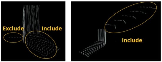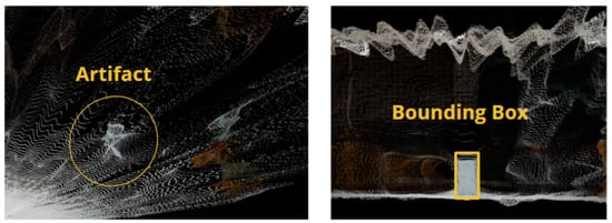 The artifact points within the data from the fusion system without interpolation were isolated from the rest of the environment. The following convention was used when isolating the artifact points in the fused data with interpolation fusion: points that were above the ground and were between the sensors and the artifact were included in the artifact set, while single-line trailing points emitting from the back of the artifact were excluded. Figure 3 provides visual examples of this convention. The 1 m and 2 m scan tests of the stereoscopic data produced clear artifact point sets with the only encountered obstacle separating the ground points from the artifact ones. The remaining tests did not contain a distinguishable artifact. These issues were expected because the maximum range listed within the Realsense camera’s manual is 3 m. For these tests, the artifact sets were cropped by viewing the full point cloud from the camera’s position and creating a 2D bounding box covering the estimated location of the visible artifact’s side. A visual demonstration of this process is shown in Figure 4. These cropped point clouds were analyzed, and their performance was compared to the other fusion system for completeness.