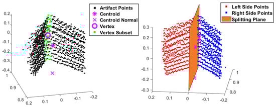 Once the artifact point cloud sets were established, each set needed to be split into two to represent the left and right plates that compose one of the test artifact’s sides. A splitting plane formation process was created to ensure consistency throughout the analysis. Three points were calculated from the artifact point cloud to define this plane: the centroid of the artifact points was determined by calculating the average location value, the normal point which is a point that is in line with the centroid point calculated by using a directional vector equal ground plane’s normal vector and is located near the ground plane, and the centroid point (referred to as the vertex point) of a bounding box encompassing the vertex of the artifact. The splitting plane and its point-normal equation were derived from these three points. Once the plane was formed, the coordinates for each artifact point were inserted into the splitting plane’s point-normal equation. The sign of the result would indicate on which side of the splitting plane the points were located. Figure 5 illustrates this splitting process.