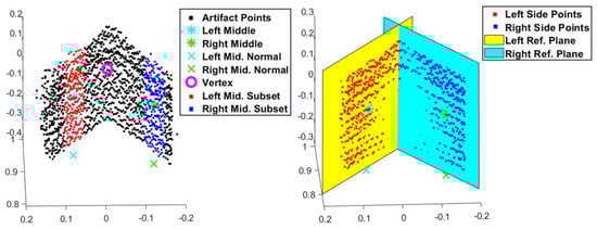 where represents the x-axis of the reference plane, is the reference plane’s y-axis, which is equal to the ground plane’s normal vector, is the origin point of the reference plane’s coordinate system, and is an artifact point’s location relative to the full point cloud. Note that was determined by finding the vector that was perpendicular to its respective reference plane’s y-axis vector and normal vector (z-axis). The middle normal point used in creating the reference plane acted as the origin for its corresponding reference plane because the point was always located below the artifact points.