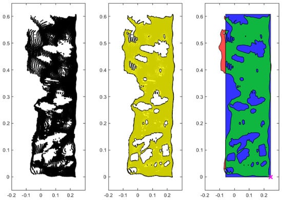 A series of plots visually describing the sequence of determining the point coverage of a set of artifact points. For these images, the stereoscopic data of the left−undetectable side at 1 m test was used, with the projected artifact point on the left reference plane shown in black (left), forming the shape of the total point coverage shown in yellow (middle), and determining the point coverage of the test artifact’s expected area with the artifact’s bounding box in blue, the centroid normal in pink x, point coverage in green, and error in the point coverage in red (right).