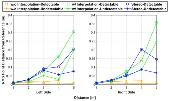 The results shown in Figure 11 match the general observations: the without interpolation fusion points consistently ranked the highest with the shortest RMS values as compared to the other fusion methods. As with the other two fusion methods, as the test distance increased, the point spread increased their artifact sets. Interestingly, the detectable side ranked the lowest as compared to their undetectable counterpart. This behavior could be attributed to subjective error from the isolation process of the artifact points. It was easier to isolate the light-colored detectable side points than the dark-colored points of the undetectable side because of the better visibility. Also, as seen during the development of the test artifact, there were fewer points in the undetectable artifact point clouds as compared to the detectable side point clouds. The points further away from the reference planes were most likely not registered in the raw-colored point clouds because of their low-intensity backscattering values.