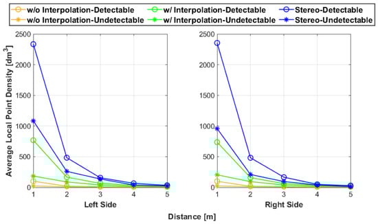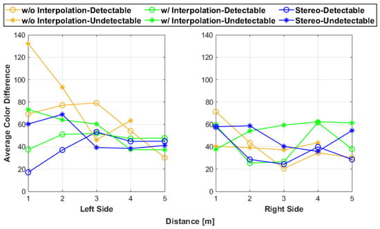 Figure 13 matches with some of the expected behavior found in the observations. Both the fusion with and without interpolation performed worse at close distances than the stereoscopic data for the left side, but as the test distances increased, all the data seemed to converge to the same range of values for both the left and right sides. This behavior is valid because as the distance increased, the color within the pixels had less variation since the test artifact was smaller relative to the camera. Despite capturing the LiDAR–camera calibration error, the color difference results did not capture all the observations related to the color quality of the point clouds.