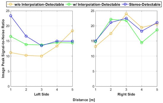 where is the mean squared error of the color difference and is the max intensity of the reference value. Figure 14 shows the results of the PSNR analysis. As expected, Figure 14 exhibits the inverse behavior of Figure 13. This is because the noise increased as the color difference increased, which resulted in a lower PSNR value. However, note that the theoretical peak image value of the PSNR for the undetectable side was (0, 0, 0). Therefore, the PSNR could not be calculated for the undetectable side. Hence, the color difference metric seems more sufficient for testing with the reference artifact used in this work.