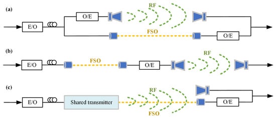 The hybrid RF/FSO system structure. (a) Discrete parallel structure; (b) discrete serial structure; (c) integrated shared transmitter structure. (Green: RF link; Yellow: FSO link).