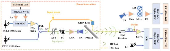Figure 3 illustrates the experimental setup of the RF and FSO fusion system. On the transmitter side, a baseband signal is generated by a 120 GSa/s arbitrary waveform generator (AWG), model M8100 series from Keysight (Santa Rosa, CA, USA). The signal is then amplified by electric amplifiers (EAs) and modulated by an I/Q modulator onto an optical carrier generated by ECL1 (at 1550.73 nm). After passing through a polarization-maintaining Erbium-doped fiber amplifier (PM-EDFA) from Amonics (Hong Kong, China), the modulated signal is combined with the optical signal from ECL2 (at 1550.00 nm), resulting in a signal at 91.25 GHz, in the millimeter-wave band. The signal is split into two paths: in the electrical path, it first passes through an attenuator (ATT) to adjust the power input to the photodiode (PD), model Finisar XPDV3120R (Sunnyvale, CA, USA). The PD converts the optical signal into an electrical millimeter-wave signal, which then passes through a low-noise amplifier (LNA), model AT-LNA-75110-3504HP from AT Microwave (Shanghai, China) with 35 dB gain, and is transmitted via a horn antenna (HA) with 25 dBi gain into free space. The signal passes through a dielectric plate made of PMMA, transparent to MMW radiation. In the optical path, a self-focusing lens (GRIN lens), model F810FC-1550 from Thorlabs, generates parallel light incident on the PMMA plate, which is 5 mm thick. The plate reflects the optical signal, and by adjusting the angle of the plate, the optical and electrical signals remain on the same path. The wireless transmission distance in this experiment is 1 m, eliminating the need for lens-based focusing due to the short distance. The physical diagram of the key components in the shared transmitter is shown in Figure 4.